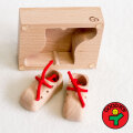 この小さい靴と台は、同じ1枚の板からできているのです!ですから、靴の切り出しはとても慎重。切り出した後は、ひとつひとつ丁寧に研磨され、職人技でピタッと合うように仕上げられています。時間と手間を惜しみなく注いで作られますので、とっても仕入に時間がかかる木のおもちゃなのです。赤ちゃんの写真と一緒に飾っても可愛いですよね!