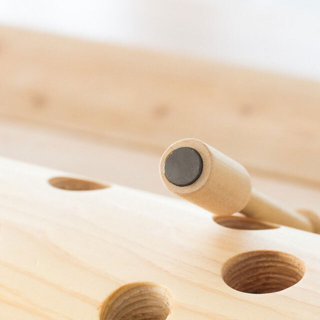 イモムシさんを吊り上げる際に使用する「ひっつき棒」と、イモムシさんにはマグネットが付いています。イモムシさんには、お顔とおしりの両方にマグネットが付いており、どちらでもピタッとくっつく工夫がされています。持った時のバランスとイモムシさんがくっついた時の手に伝わる感触を大事に作られています。